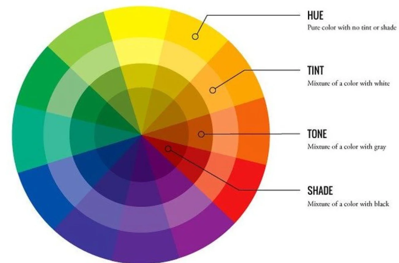 Shades: Just like adding a touch of mystery! Shades are created by adding black to a hue. Think a sophisticated navy (blue + black) or a rich plum (purple + black). Shades tend to be darker and can add depth and elegance.